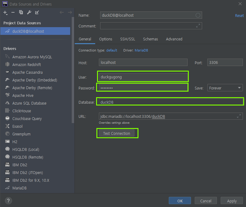 - User, Password, Database 부분에 각각 위에서 설정한 내용을 입력한 후 Test Connection을 클릭한다.