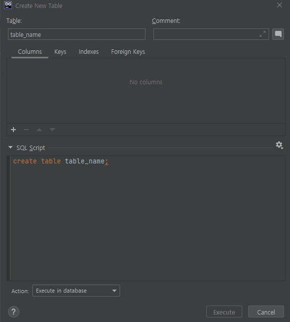 - Create New Table 창이 나오면 테이블 이름과 comment를 적어주자.