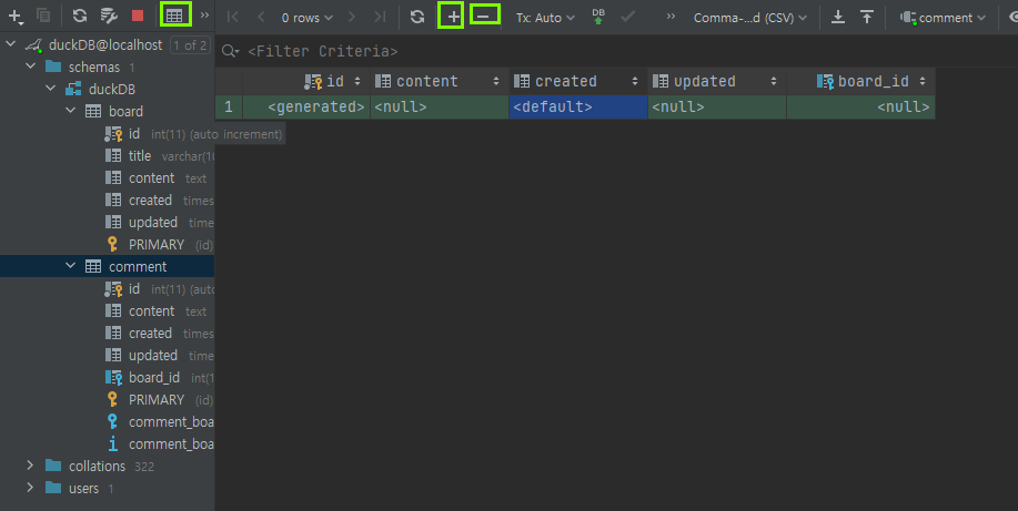 - 원하는 테이블을 더블클릭 하거나 클릭 후 상단의 edit data 아이콘을 클릭 한 후, 나오는 화면의 상단의 + 아이콘을 클릭하면 새로운 행이 하나 추가된다. 내용을 입력 후 DB 아이콘을 클릭하면 commit 된다.