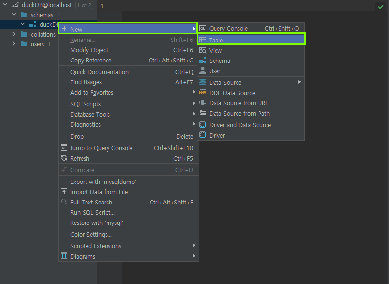 - GUI를 이용해서 테이블을 생성하려면 DB를 우클릭한 후 아래 그림처럼 클릭하면 된다.